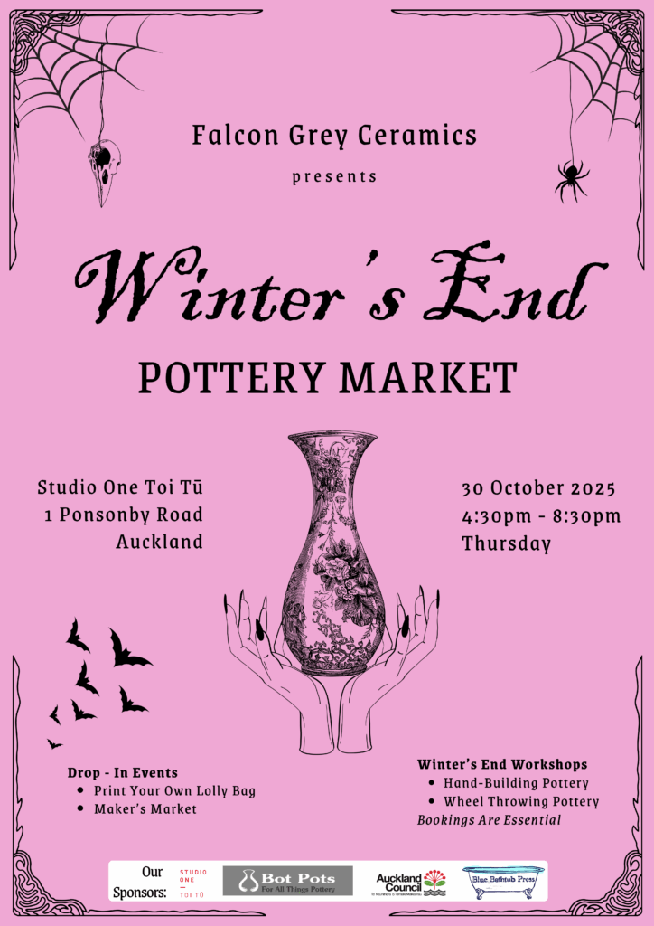 Thank you to The Arts House Trust for hosting this event and thank you to our sponsors and supporters; Alt Group, Auckland Studio Potters, Bot Pots, Clevedon Buffalo Co., Creative NZ, Crown Self Storage, Driving Creek Railway, Falcon Grey Ceramics, Glass Station, Kiwi Underglaze, and Northern Lights. Your support in this event has been unwavering and helps to promote artists in this craft. Thank you.