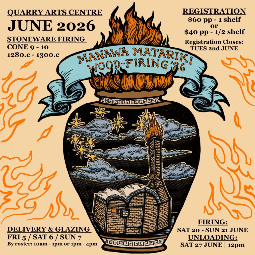 Spaces are selling fast on our largest communal wood firing of the year, set to take place June 20-21 under the Matariki stars. Last year’s firing saw over 800 pieces of work fired by 50+ Northland potters. Register for a full or half shelf soon to avoid missing out! Registration ends June 2nd . Firing: Cone 10 | Stoneware clays. Woodfire Kilns – Quarry Arts Centre